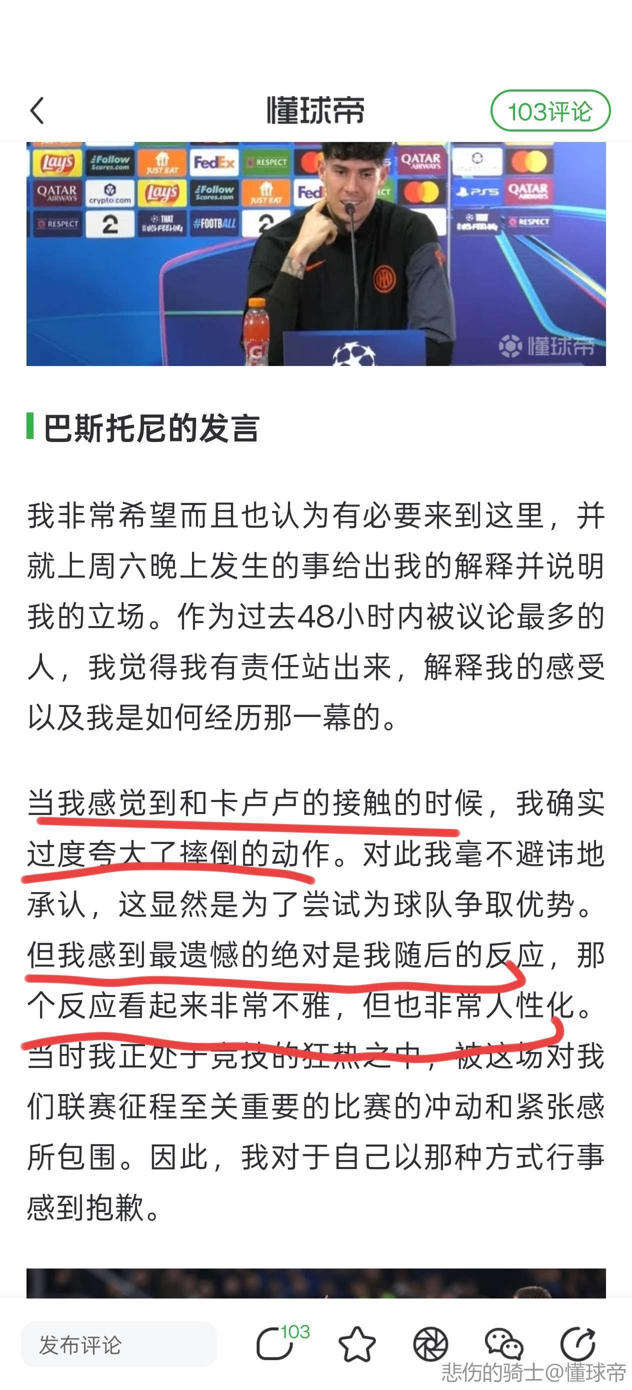 我听到的一些业内人士说的话简直是无稽之谈,但这本来就是我们职业的一部分。相反,我要感谢那些说实话的人,那些说“巴斯托尼错了,他表现得很愚蠢”的人,因为足球场上确实会发生这些事。人类之所以成为人,是因为拥有犯错的权利,但也必须承担承认错误的义务,我今天来到这里正是为了这个目的。