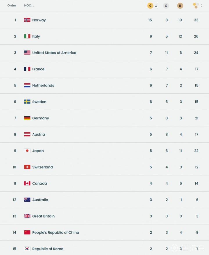 苏翊鸣和徐梦桃为中国代表团连夺两金,邵琪为中国队摘得铜牌。本个比赛日中国队收获两金一铜,上升至奖牌榜第十四位。