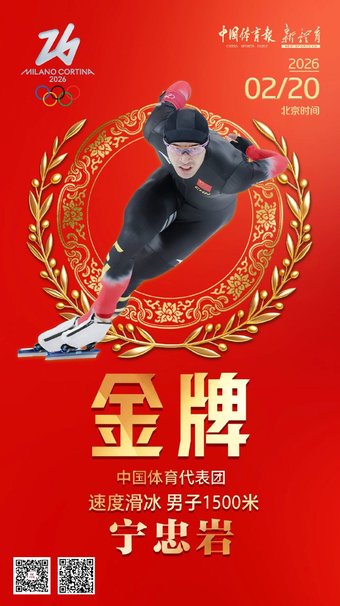 北京时间2月20日,米兰冬奥会速度滑冰男子1500米决赛,中国选手宁忠岩 以1分41秒98的成绩,刷新奥运纪录夺得冠军。这也是本届冬奥会上,中国体育代表团收获的第三枚金牌,宁忠岩个人的第三块奖牌!