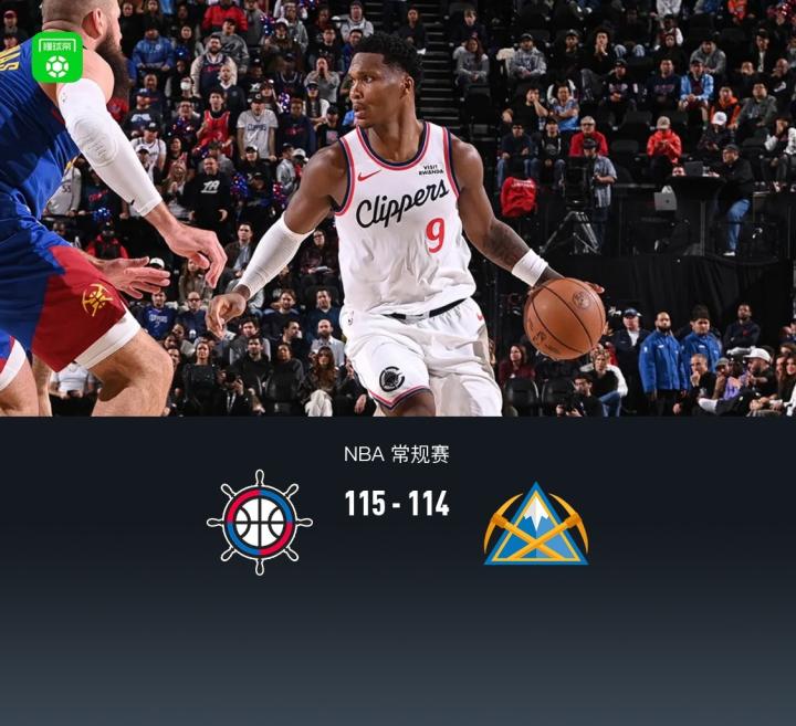 第四节,开节快船马图林继续冲框稳住领先优势,随后掘金瓦兰、穆雷相继造杀伤罚球反超6分,随后快船马图林、琼斯持续冲框造杀伤再度追上比分,比赛最后2分钟多钟快船琼斯、马图林继续得分领先5分,掘金约基奇站出来连得5分追平,紧跟快船马图林造杀伤罚球再度领先,随后掘金约基奇强攻遭大洛封盖,回头快船琼斯两罚领先4分,随后掘金犯规战术,穆雷命中关键三分追至1分,随后快船罚球继续全中领先3分,最后一攻掘金穆雷造成琼斯三分犯规,但最后一罚不中错失绝平,最终快船115-114战胜掘金。