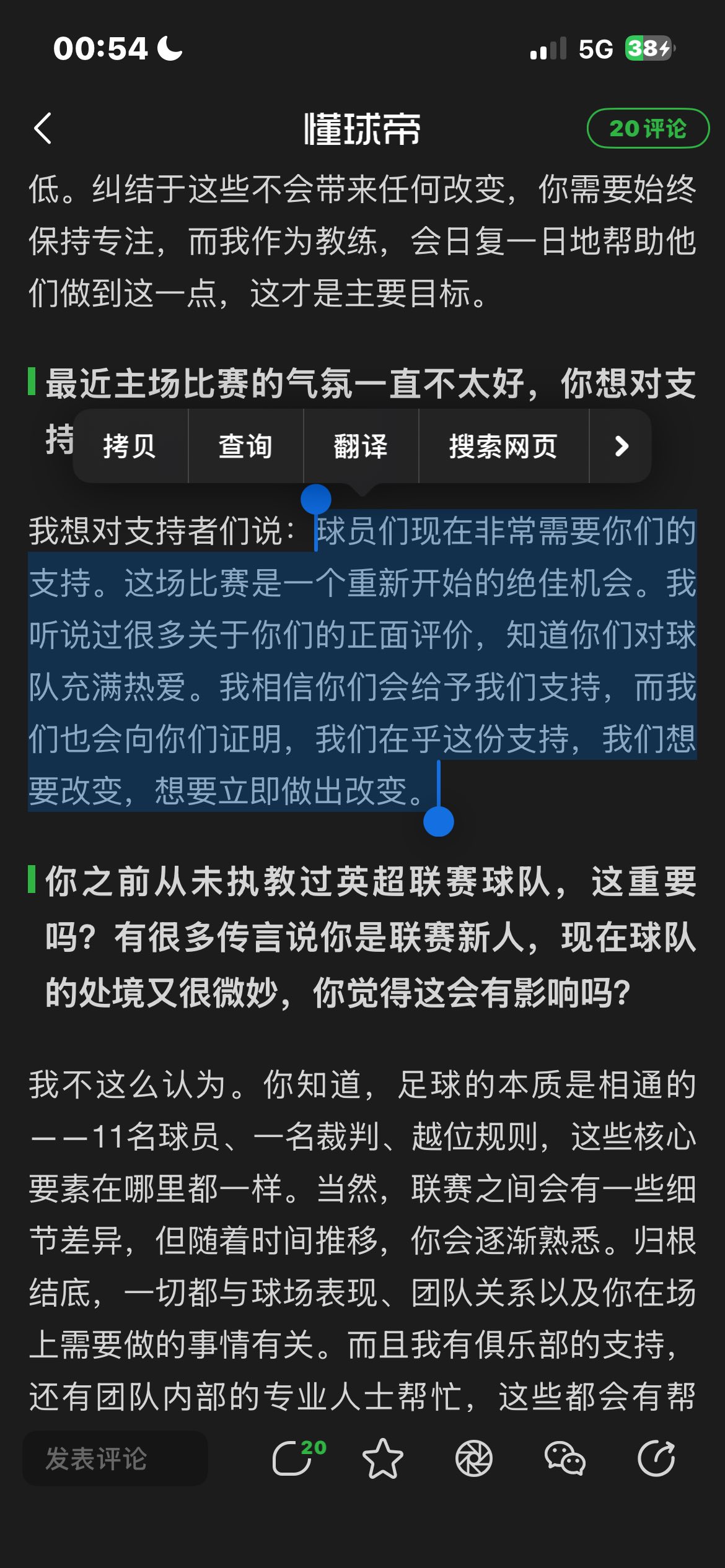 我想对支持者们说:球员们现在非常需要你们的支持。这场比赛是一个重新开始的绝佳机会。我听说过很多关于你们的正面评价,知道你们对球队充满热爱。我相信你们会给予我们支持,而我们也会向你们证明,我们在乎这份支持,我们想要改变,想要立即做出改变。