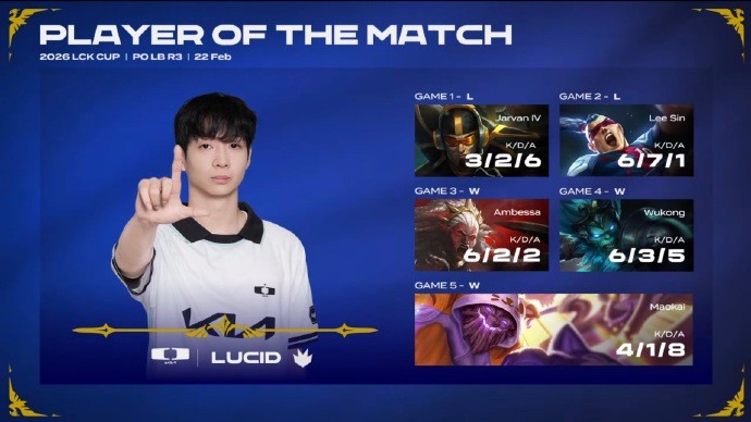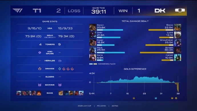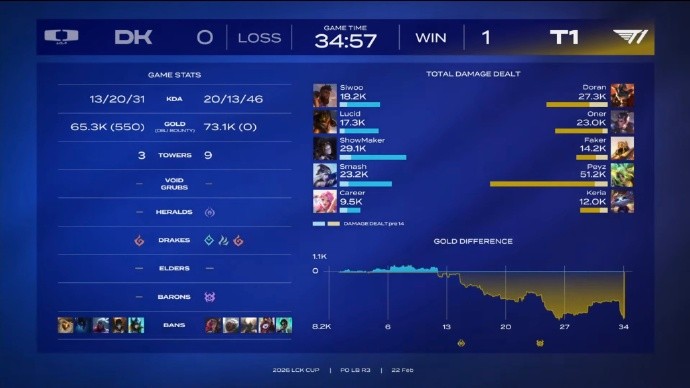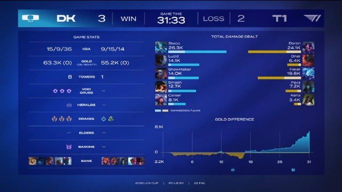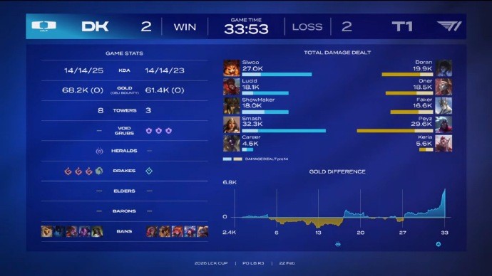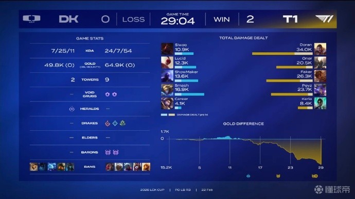 2月22日,LCK杯败者组半决赛,T1对阵DK。DK在0-2落后的情况下连追三局战胜T1,晋级LCK杯败者组决赛。