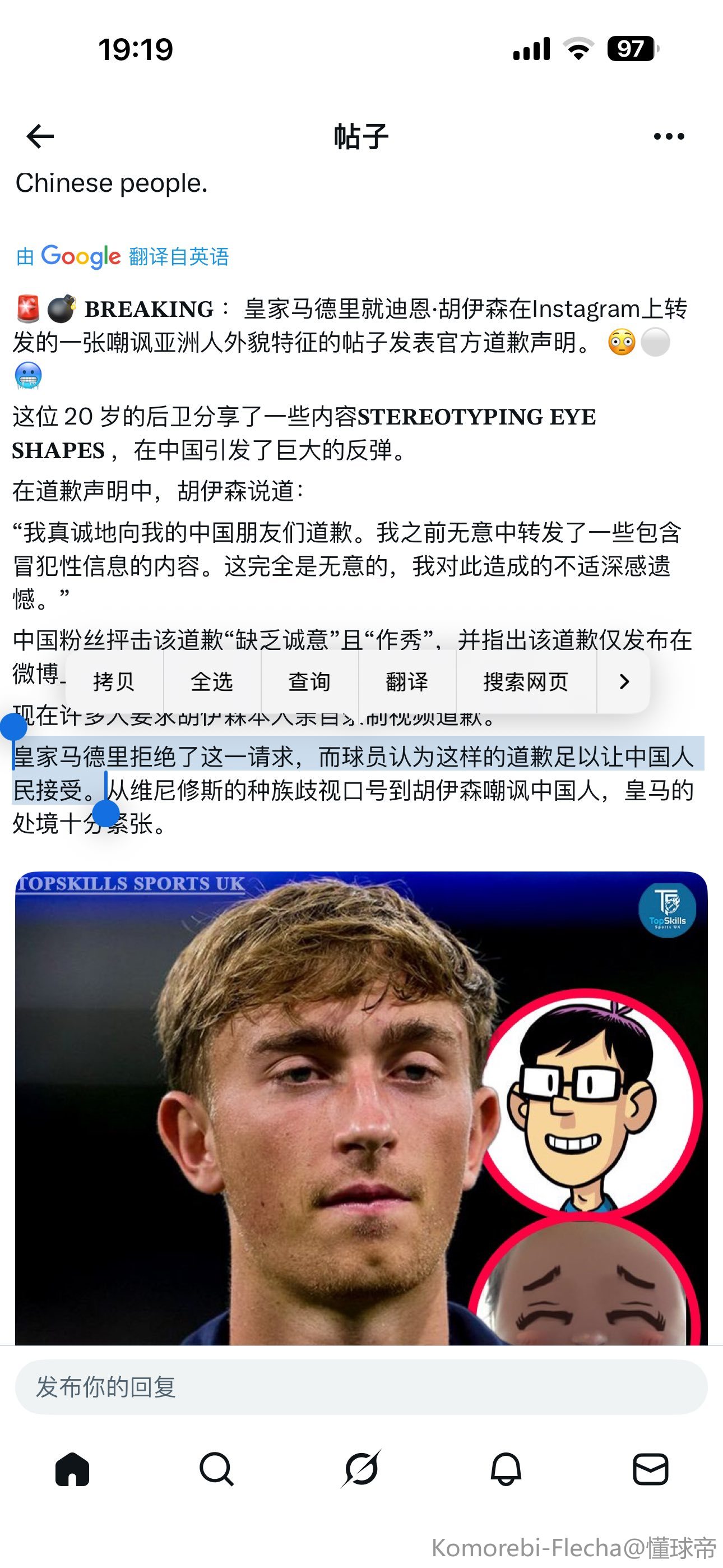 扫描下载懂球帝首页>动态> 荷媒关注赫伊森社媒辱华:球员已为此道歉,希望风波就此平息