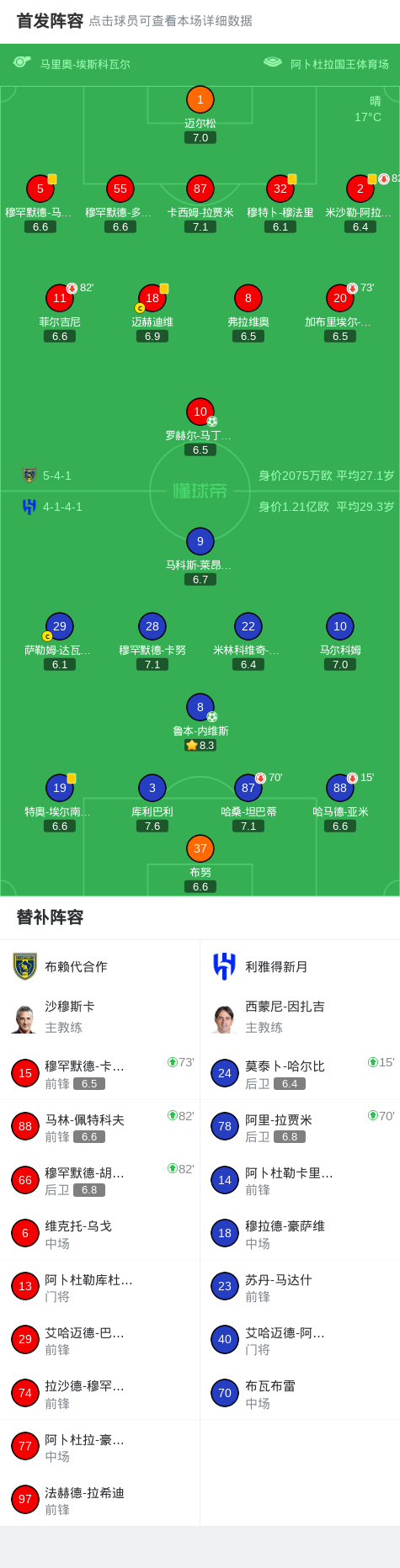 布赖代合作1-1利雅得新月,鲁本-内维斯先拔头筹,罗赫尔-马丁内斯救主