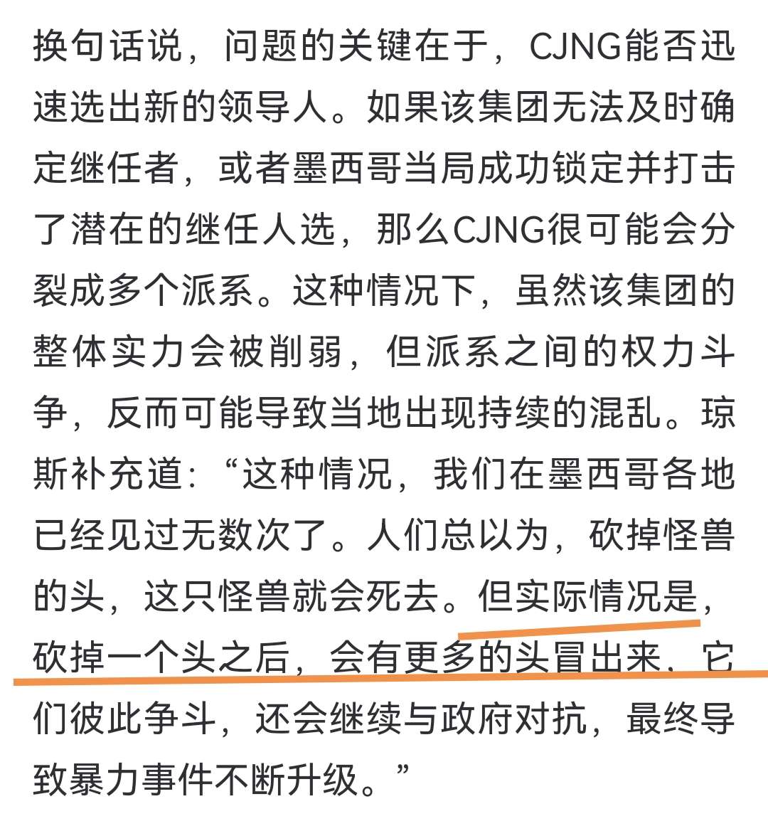 换句话说,问题的关键在于,CJNG能否迅速选出新的领导人。如果该集团无法及时确定继任者,或者墨西哥当局成功锁定并打击了潜在的继任人选,那么CJNG很可能会分裂成多个派系。这种情况下,虽然该集团的整体实力会被削弱,但派系之间的权力斗争,反而可能导致当地出现持续的混乱。琼斯补充道:“这种情况,我们在墨西哥各地已经见过无数次了。人们总以为,砍掉怪兽的头,这只怪兽就会死去。但实际情况是,砍掉一个头之后,会有更多的头冒出来,它们彼此争斗,还会继续与政府对抗,最终导致暴力事件不断升级。”