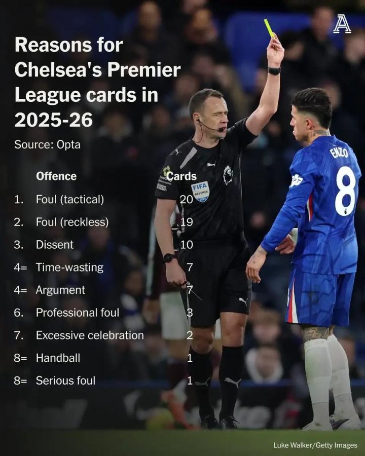 扫描下载懂球帝首页>动态> 切尔西本赛季英超吃牌原因排行:战术犯规20张,表达异议10张