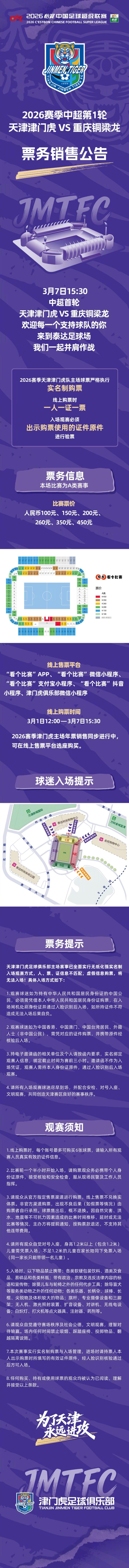 扫描下载懂球帝首页>动态> 津门虎中超首轮vs铜梁龙票务公告:1日12:00开售,票价100元起