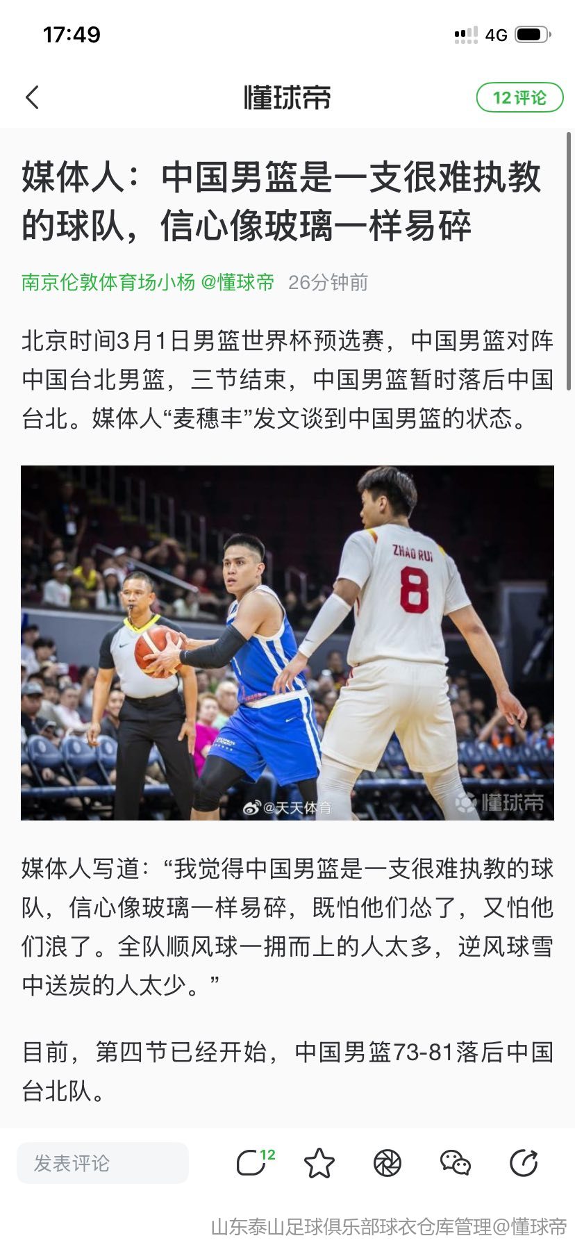 赵继伟追身三分命中完成反超!中国男篮15-12中国台北