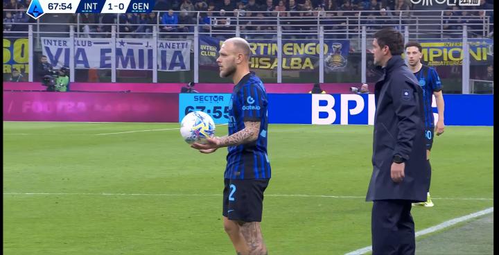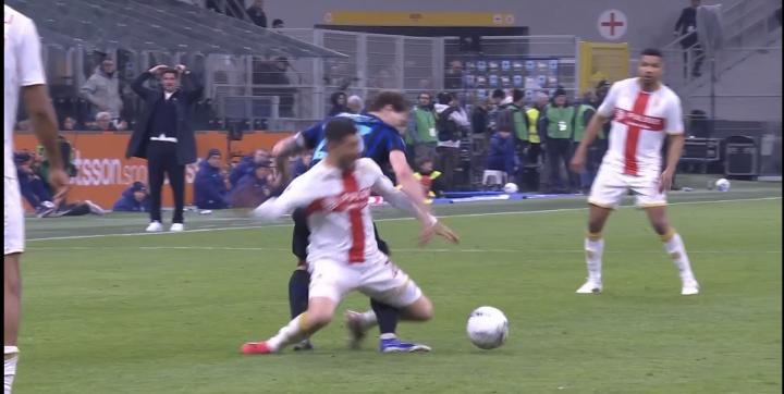 国米的点球获得,正是巴雷拉持球策划进攻,传给右侧的恩里克,后者射门打中门柱,随后再次传中,造成对方后卫手球。