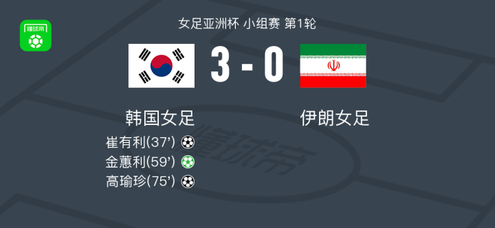 北京时间3月2日女足亚洲杯 小组赛 第1轮,韩国女足对阵伊朗女足。韩国女足崔有利破门,高瑜珍破门,金蕙利破门。最终比分韩国女足 3-0 伊朗女足。