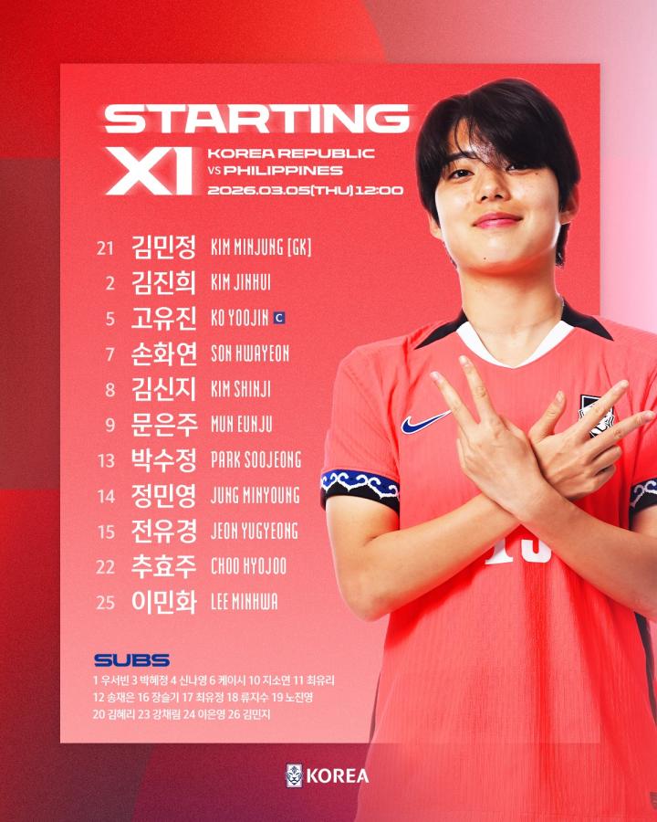 本场比赛,韩国女足主帅申相再次排出了4141的阵型。但考虑到上轮比赛韩国女足30脚射门只打入3球的效率低下,申相又选择了对阵容进行大轮换,尤其是给一些年轻人比赛的机会。首发11人中,除了门将金珉贞、上轮进球的后卫高瑜珍,前腰文恩珠和后腰郑敏煐外,其余七人都进行了轮换。在欧洲效力的全侑卿、朴洙正、金信智这三名通过U20世界杯崛起的“新星”首度踏上了亚洲杯的舞台,而联赛冠军后卫李民花和秋孝柱也一起进入了首发大名单,再加上前锋孙化然,韩国女足整体以一套更“新”的阵容去迎战菲律宾。