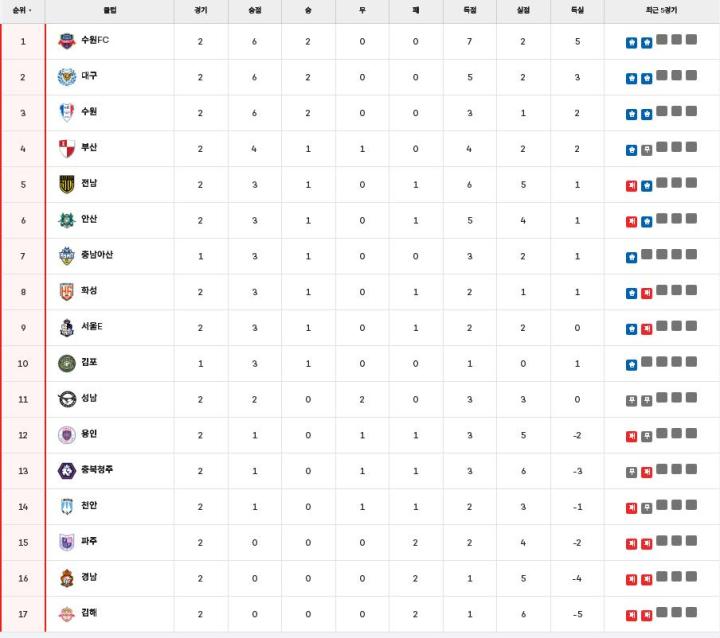 至此,2026赛季K2联赛第二轮比赛全部结束,在忠南牙山本轮轮空的情况下,水原FC、大邱FC和水原三星蓝翼位居三甲,坡州、庆南和金海两战皆墨位居后三位。下周,K2联赛将继续进行争夺,我们继续期待精彩比赛的呈现。