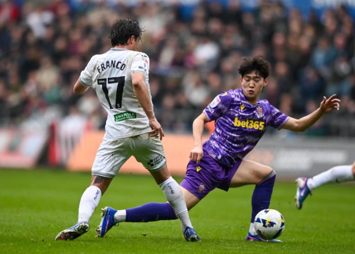我们再看英冠的一场“韩国德比”。严智星所在的斯旺西城主场迎来了裴俊浩所在的斯托克城,两人分别进入彼此阵营先发,进行同场竞技。本场比赛,双方都拿出了最佳状态,先是严智星连续过人后送出直传,可惜队友射门被门将扑出;接着裴俊浩就在禁区内射门还以颜色,斯旺西城后卫奋力用腿将必进球挡出。随后,严智星在左路带球突破后准备射门,结果被对手球员托马斯从侧面狠狠撞倒,他也为球队赢得了任意球,并让对手吃到了黄牌。随后,裴俊浩就利用一次反击机会,利用速度生吃对手后防,杀到小禁区底线准备传球时,被对手飞铲封堵,由于对手先铲到了球,因此不会判罚点球。