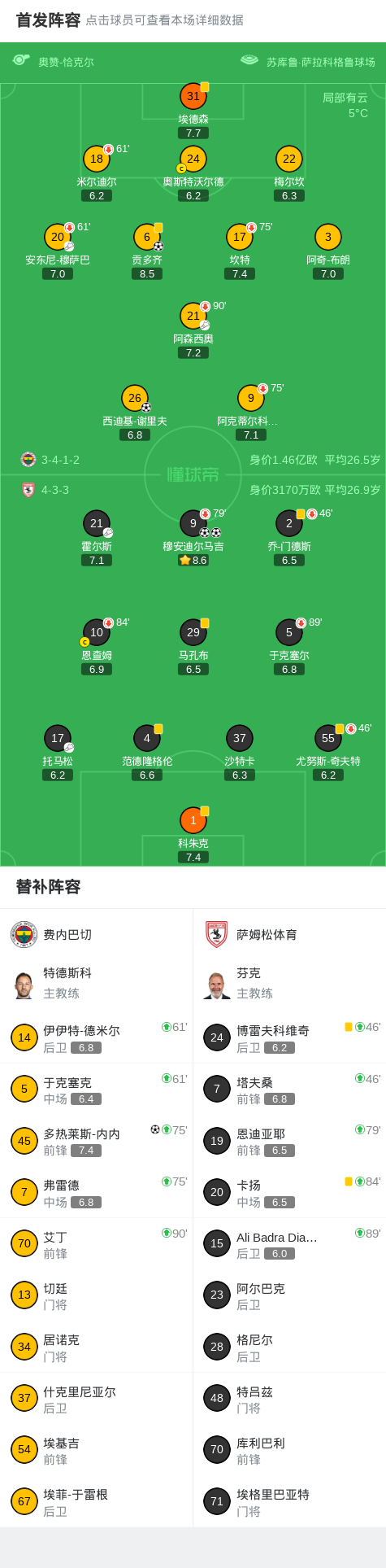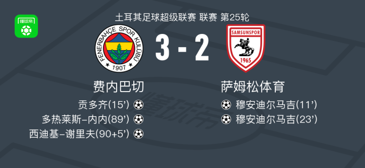 北京时间3月9日土耳其足球超级联赛 联赛 第25轮,费内巴切主场对阵萨姆松体育。费内巴切贡多齐破门,多热莱斯-内内破门,西迪基-谢里夫破门。萨姆松体育穆安迪尔马吉梅开二度。最终比分费内巴切 3-2 萨姆松体育。