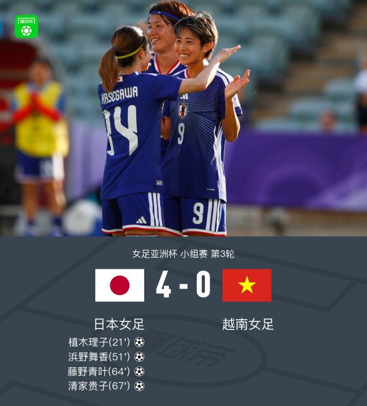 北京时间3月10日女足亚洲杯小组赛 第3轮,日本女足对阵越南女足。日本女足植木理子、浜野舞香、藤野青叶、清家贵子分别破门,谷川萌萌子送出两次助攻。最终比分日本女足4-0越南女足三连胜小组头名出线,越南女足则被淘汰。