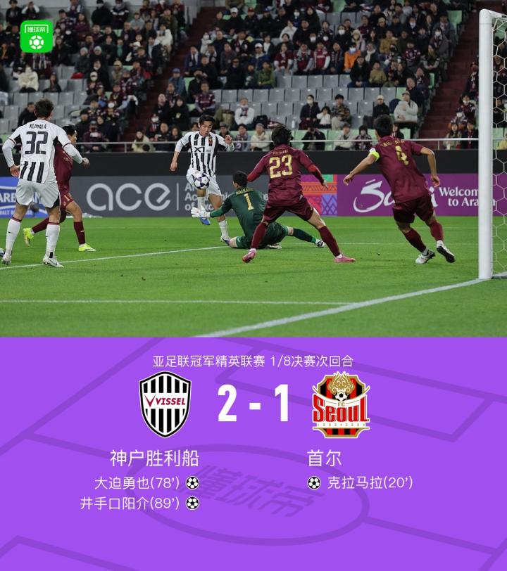 北京时间3月11日亚足联冠军联赛精英赛 1/8决赛次回合,神户胜利船对阵首尔。上半场克拉马拉率先破门,随后下半场大迫勇也扳平比分,井手口阳介挑射锁定胜局。最终比分神户胜利船 2-1 首尔FC。两回合总比分神户胜利船3-1首尔FC。