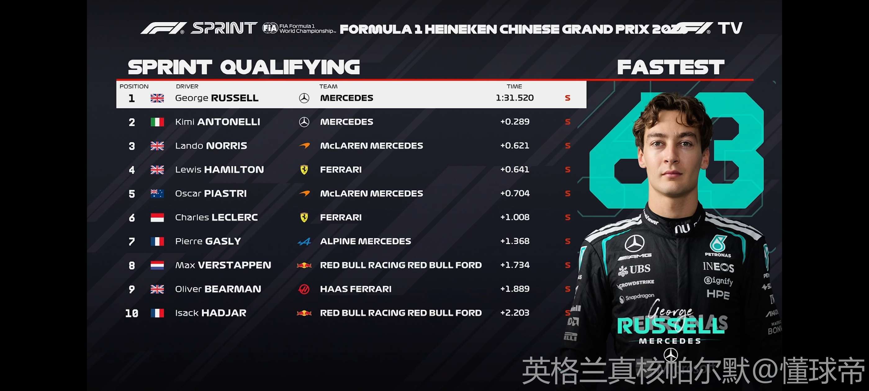 北京时间3月13日,F1中国大奖赛冲刺排位赛结束,最终拉塞尔夺杆,安东内利第二,诺里斯第三,汉密尔顿第四,皮亚斯特里第五,勒克莱尔第六,加斯利第七,维斯塔潘第八,贝尔曼第九,哈贾尔第十。