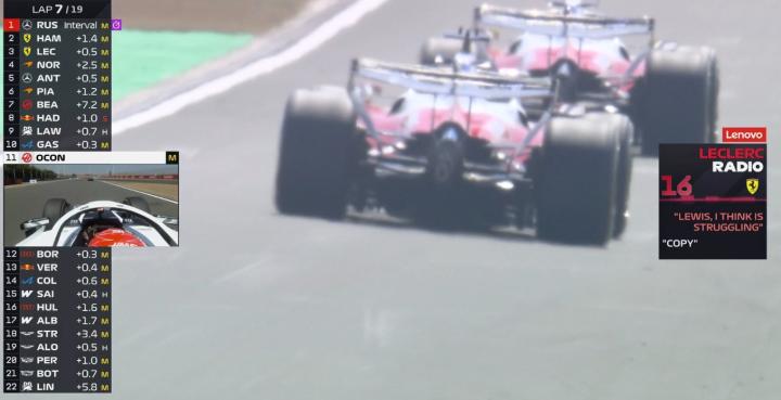 两台法拉利出现内斗,勒克莱尔超过汉密尔顿来到第二。
