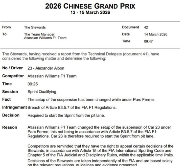 阿尔本由于更改悬挂设置,将从维修区发车