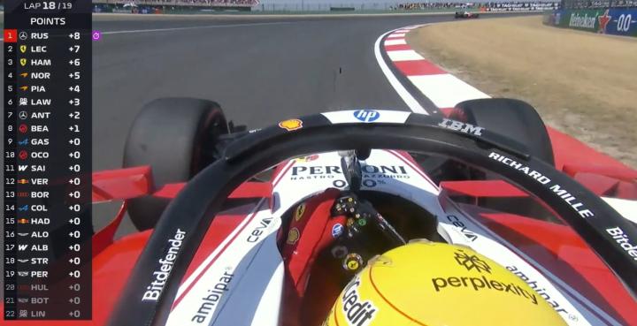 最终拉塞尔率先冲线,勒克莱尔第二,汉密尔顿第三。