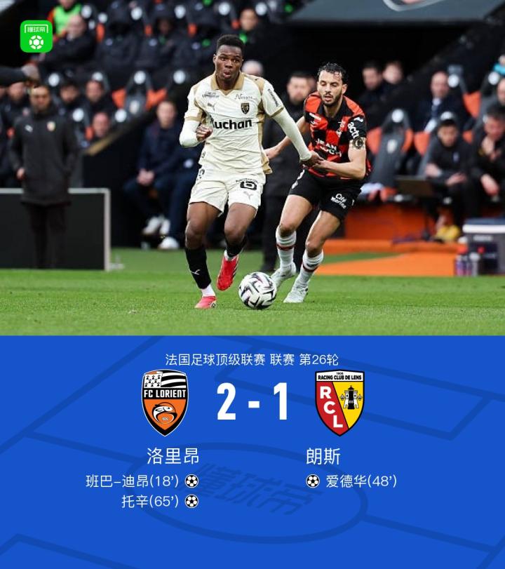 北京时间3月15日法国足球顶级联赛第26轮,洛里昂主场对阵朗斯。上半场班巴-迪昂首开记录。下半场爱德华破门扳平比分,托辛破门将比分超出。最终比分洛里昂 2-1 朗斯。