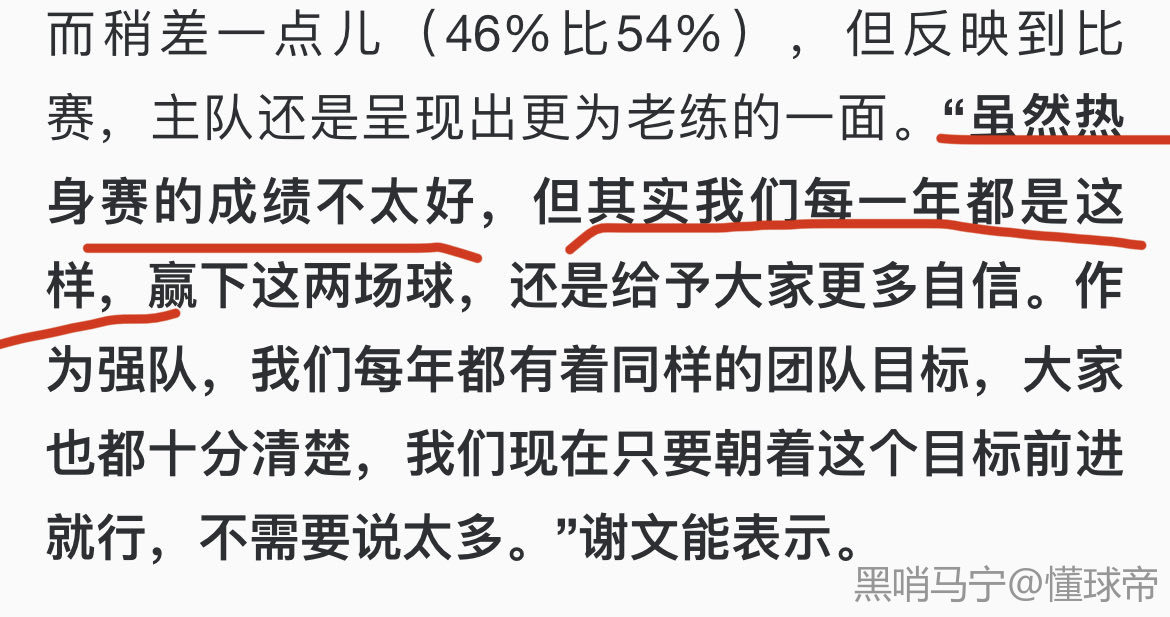然而,比赛过程多少还是有点跌宕起伏,尤其是第86分钟被扳平后。不过两分钟后,克雷桑就顶入绝杀。“我觉得还是体现出了一种不放弃的精神,大家在没有机会的时候,踢得十分耐心。每个人都不惜跑动,然后等待机会、寻求进攻。”谢文能对记者说。实际上在本场比赛,两队射门几乎旗鼓相当(9比8),控球率上,泰山队还反而稍差一点儿(46%比54%),但反映到比赛,主队还是呈现出更为老练的一面。“虽然热身赛的成绩不太好,但其实我们每一年都是这样,赢下这两场球,还是给予大家更多自信。作为强队,我们每年都有着同样的团队目标,大家也都十分清楚,我们现在只要朝着这个目标前进就行,不需要说太多。”谢文能表示。