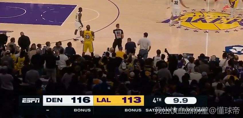 第四节,前半节双方保持拉锯,掘金微弱领先,节中段掘金布朗、琼斯相继三分拉开分差,领先来到8分,湖人詹姆斯、里夫斯冲框止血落后6分,短暂拉锯之后,湖人东契奇先是三分命中,随后造成三分犯规罚球全中追平比分,随后掘金戈登三分命中,湖人里夫斯冲框回应,随后湖人詹姆斯鱼跃扑球,紧跟斯马特抢断反击反超1分,随后掘金约基奇妙传哈达威三分反超回来2分,紧跟约基奇抢断里夫斯,随后双方犯规战术,戈登罚球二中一领先3分,湖人里夫斯第二罚故意罚丢,里夫斯二次进攻打进追平比分,双方118平进加时。