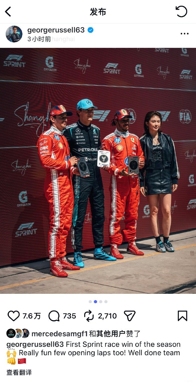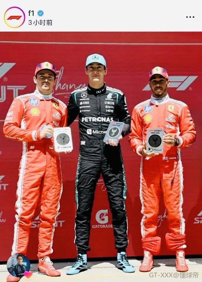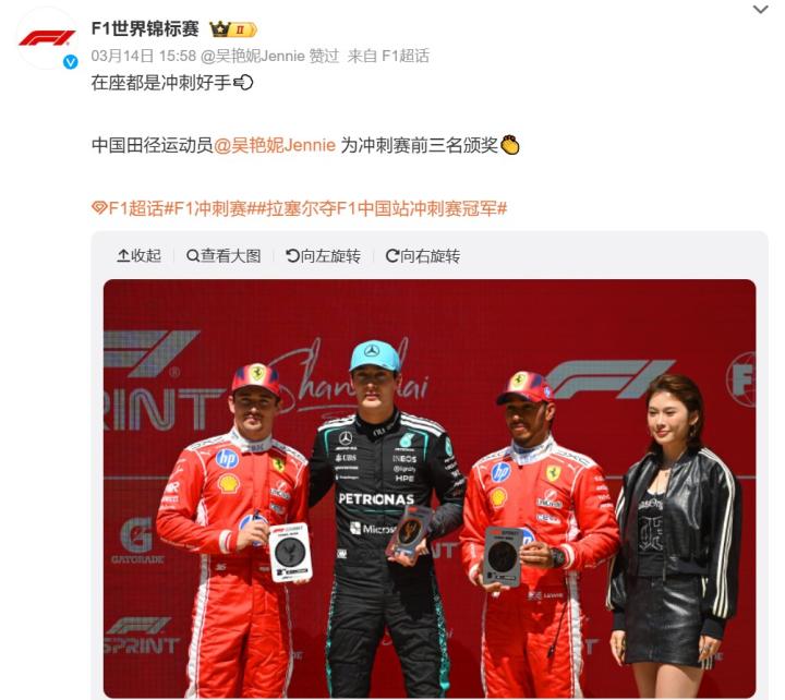 北京时间3月14日,F1中国大奖赛冲刺赛,最终拉塞尔杆位夺冠,勒克莱尔第二,汉密尔顿第三,中国田径名将吴艳妮作为嘉宾为三人颁奖。然而,在F1国外官方账号发布的合照中,颁奖嘉宾吴艳妮被裁掉,仅留一只手臂。