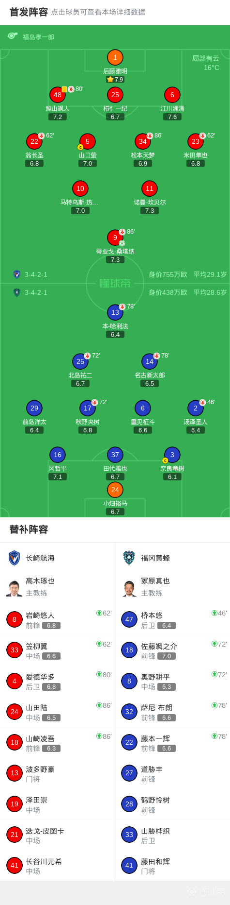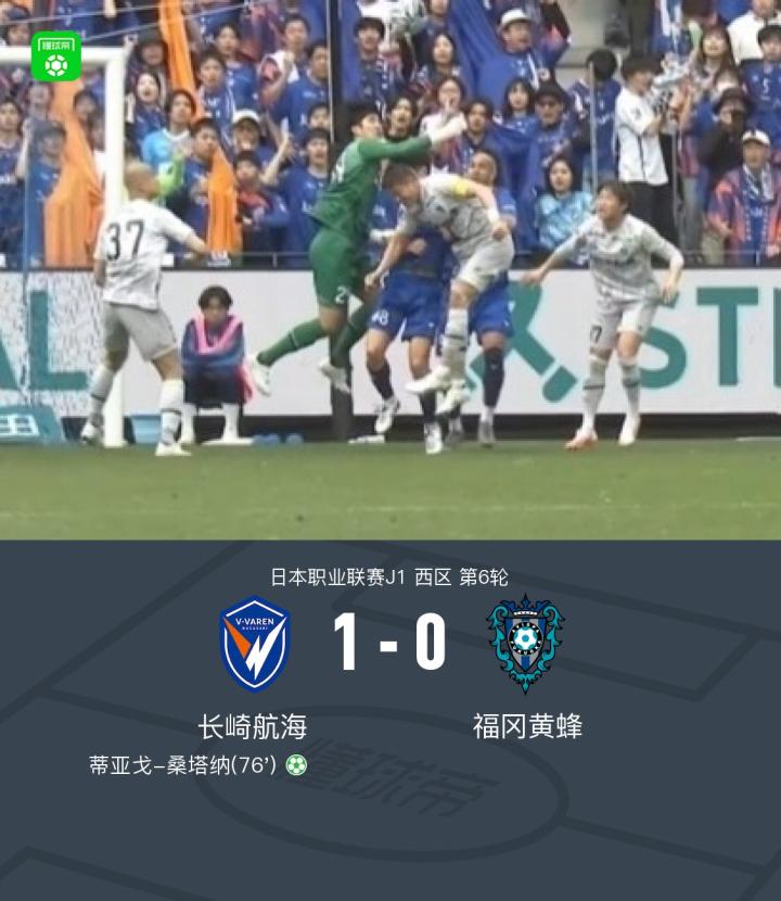 北京时间3月15日日本职业联赛J1 西区 第6轮,长崎航海主场对阵福冈黄蜂。长崎航海蒂亚戈-桑塔纳破门。最终比分长崎航海 1-0 福冈黄蜂。