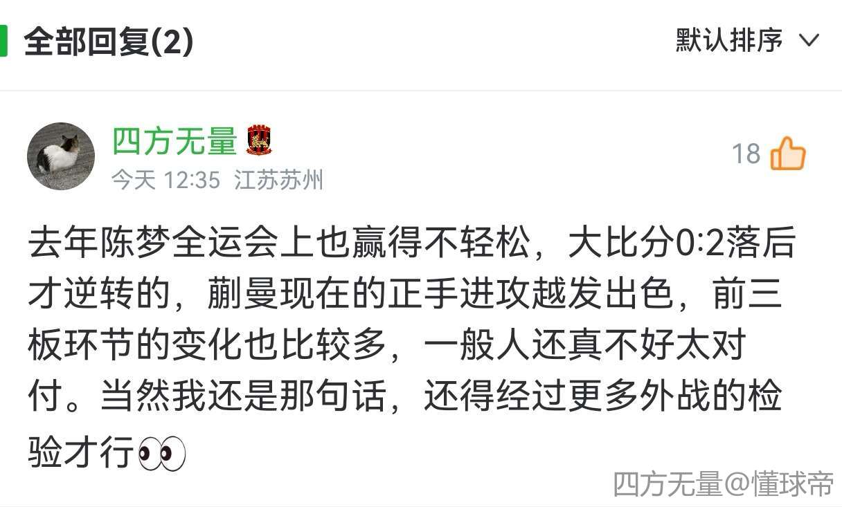 中午的时候我说过,蒯曼现在进步了不少,但是外战这块还得接受更多的考验才行,光是内战猛还不太够,比如之前的陈熠,也是战胜过孙颖莎和王曼昱的,但是现在状态也有不少起伏