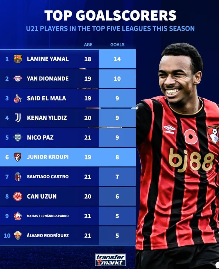 扫描下载懂球帝首页>动态> 本赛季五大联赛U21进球榜:亚马尔14球第1,迪奥曼德10球第2