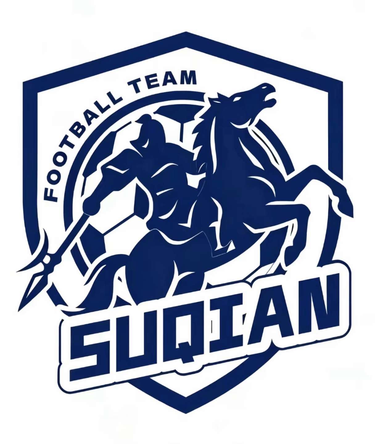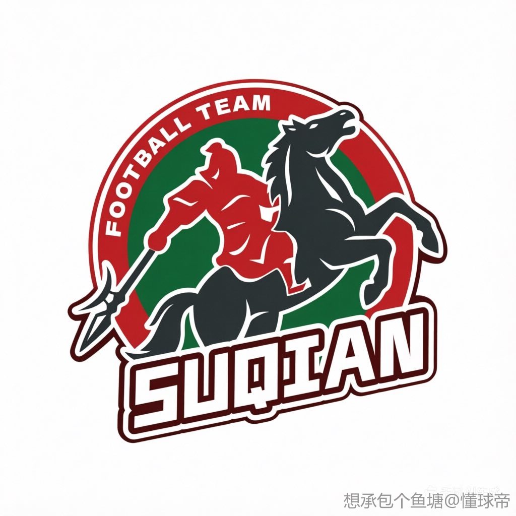 宿迁队队徽以“西楚霸王项羽”为魂,赤、黑二色为魄,将地域文化与足球精神深度融合,熔铸球队铁血军魂。主体为身披红甲的霸王骑乘乌骓马,手持长戟,姿态昂扬,既呼应宿迁“项王故里”的历史底蕴,又彰显球队勇往直前、锐不可当的精神气质。红甲与黑马搭配绿底条纹,既体现霸王勃发英姿,又体现球队驰骋绿茵的霸气与活力。外圈“FOOTBALL TEAM”与底部“SUQIAN”字样,清晰传递球队身份与地域归属,成为城市体育名片的鲜明符号。