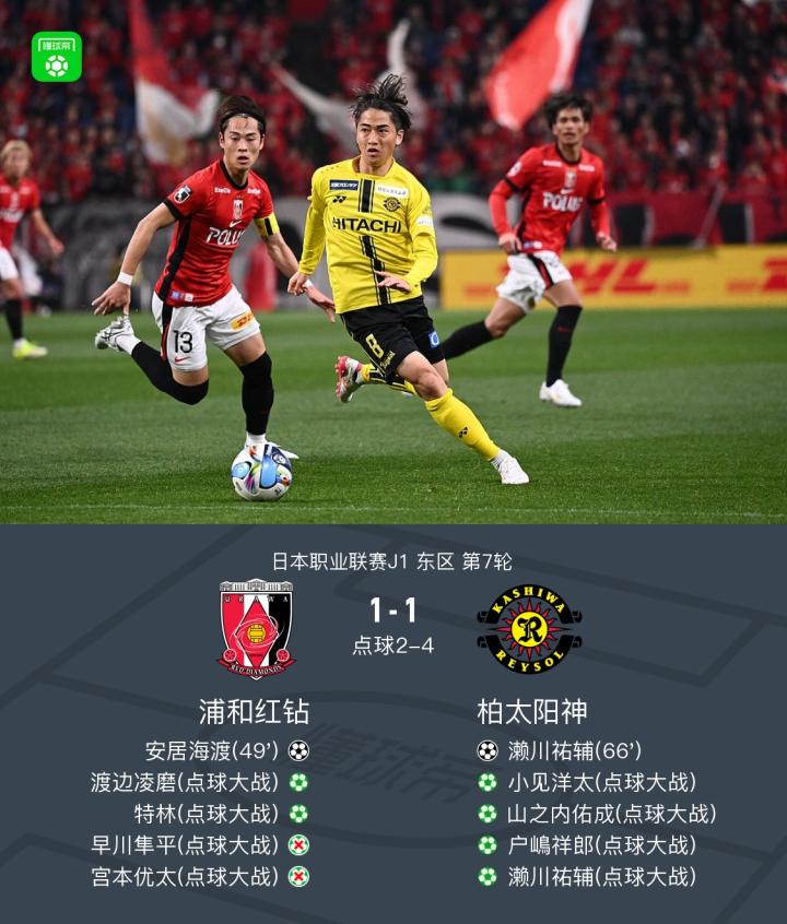 北京时间3月18日日本职业联赛J1 东区 第7轮,浦和红钻主场对阵柏太阳神。浦和红钻安居海渡破门。柏太阳神濑川祐辅破门。最终比分浦和红钻 3-5 柏太阳神。