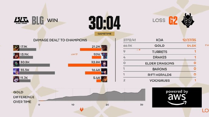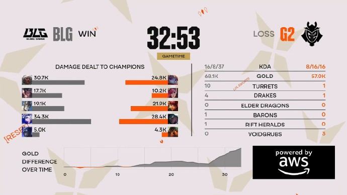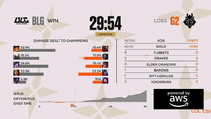 本局G2选出了一套看起来非常缺乏输出的阵容,虽然前期下路对线上G2取得了优势,波比在上路单杀了狼母。但进入中期后,BLG连续几波团战碰撞都取得了优势,Bin更是冲入敌阵以一敌三直接冲烂G2。拿下大小龙后,BLG一波结束比赛!