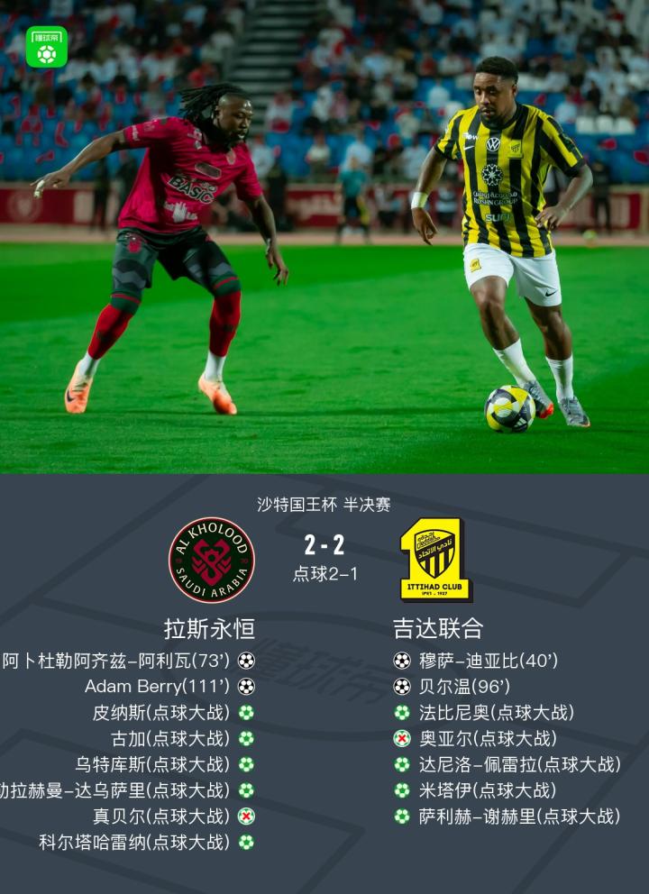 北京时间3月19日沙特国王杯 半决赛,拉斯永恒对阵吉达联合。拉斯永恒阿卜杜勒阿齐兹-阿利瓦破门,Adam Berry破门。吉达联合穆萨-迪亚比破门,贝尔温破门。最终比分拉斯永恒 4-3 吉达联合。
