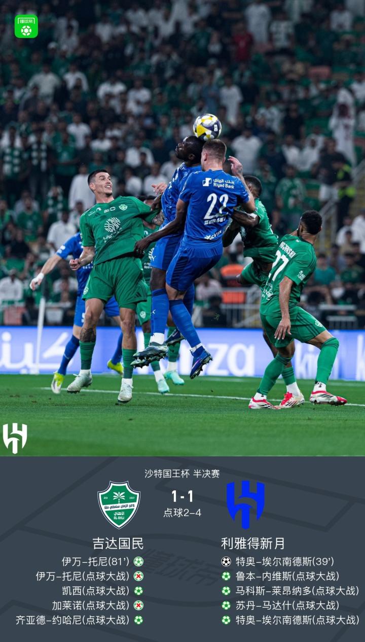 第120分钟,托尼、加莱诺失点,利雅得新月点球大战4-2战胜吉达国民