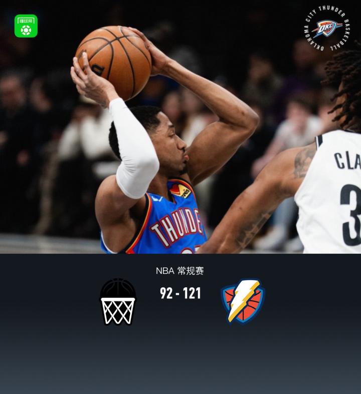 扫描下载懂球帝首页>动态> 雷霆121-92篮网豪取10连胜,麦凯恩26分,亚历山大继续20+
