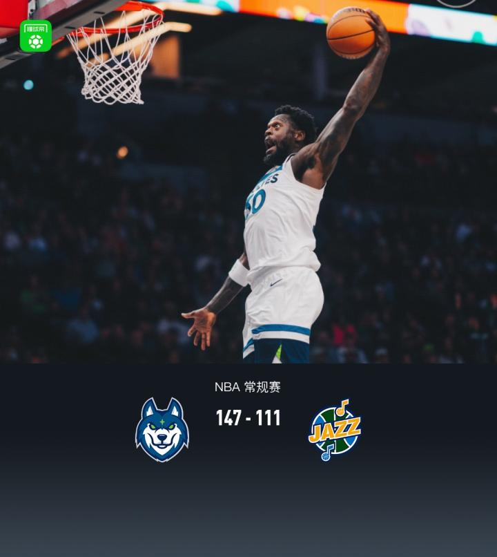 第四节森林狼杰伦-克拉克拿下9分,爵士森萨博拿下11分,最终森林狼147-111战胜爵士