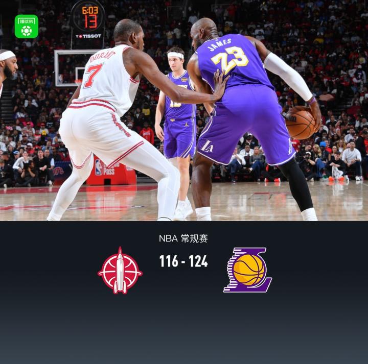 扫描下载懂球帝首页>动态> 湖人124-116再胜火箭,詹姆斯14中13轰30分,东契奇40+9+10,杜兰特18分