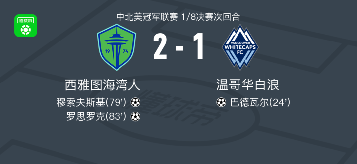 北京时间3月19日中北美冠军联赛 1/8决赛次回合,西雅图海湾人对阵温哥华白浪。西雅图海湾人穆索夫斯基破门,罗思罗克破门。温哥华白浪巴德瓦尔破门。最终比分西雅图海湾人 2-1 温哥华白浪。两回合总比分西雅图海湾人5-1温哥华白浪。