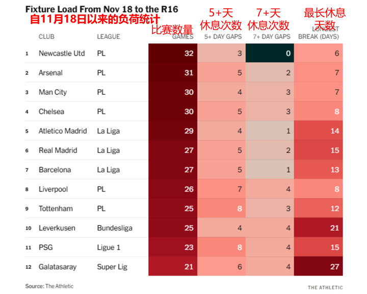 疲劳,是最常被提及的借口。英超没有冬歇期,圣诞新年赛程密集,让球队在赛季后半段身心俱疲。据统计,自上个国际比赛日窗口11月18日以来,英格兰俱乐部平均每3.97天进行一场比赛,而他们的对手平均每4.60天一场。纽卡是最极端的例子,他们踢了32场比赛,平均每3.61天一场,从未有过7天或更长时间的休息间隔。这种赛程差异,确实对球员体能产生了直接影响。