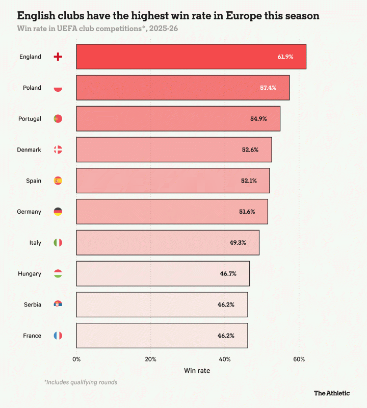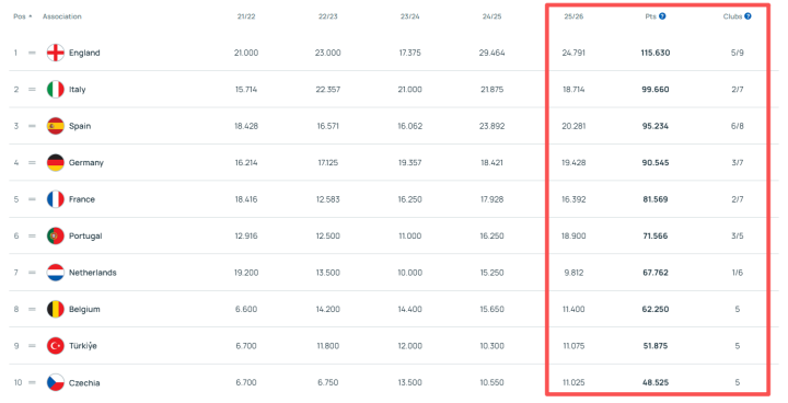 在欧足联近五年欧战系数排行榜上,英超以巨大的优势遥遥领先于其他联赛。OPTA曾在淘汰赛首回合结束时做出预测,英格兰最终排在赛季系数排名前两位的概率仍然高达99.9%,意味着即使英格兰球队输掉剩余的所有欧战比赛,其他联赛也很难超越他们目前的平均系数。长此以往,英超第五名实际上可能会成为一个永久性的欧冠席位。