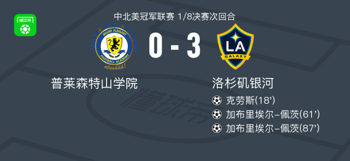 北京时间3月20日中北美冠军联赛 1/8决赛次回合,普莱森特山学院对阵洛杉矶银河。洛杉矶银河克劳斯破门,加布里埃尔-佩茨梅开二度。最终比分普莱森特山学院 0-3 洛杉矶银河。两回合总比分普莱森特山学院0-6洛杉矶银河。