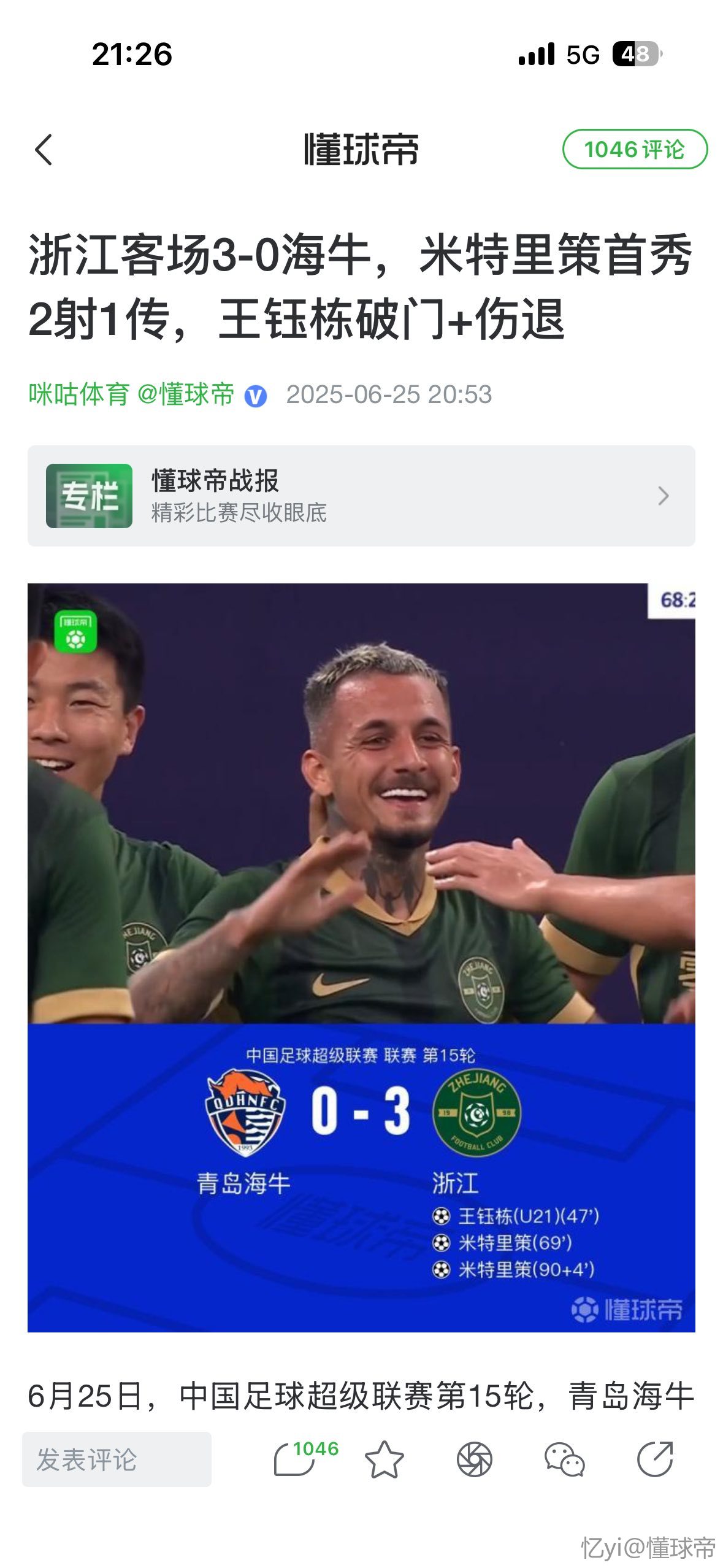 《配合一坨》《上半场装糖》《阴他一手》《54秒闪击》《海牛最严厉的父亲》《猜猜终场的更衣室发生了什么》《✋年✋年球会黄》《依旧射手榜第一》《依旧助攻榜第一》《晚安😴海牛》《装🍬浙江队是认真的》《踢的不知道天地为何物了》《这场比赛已经没有人类了》