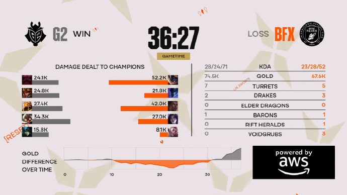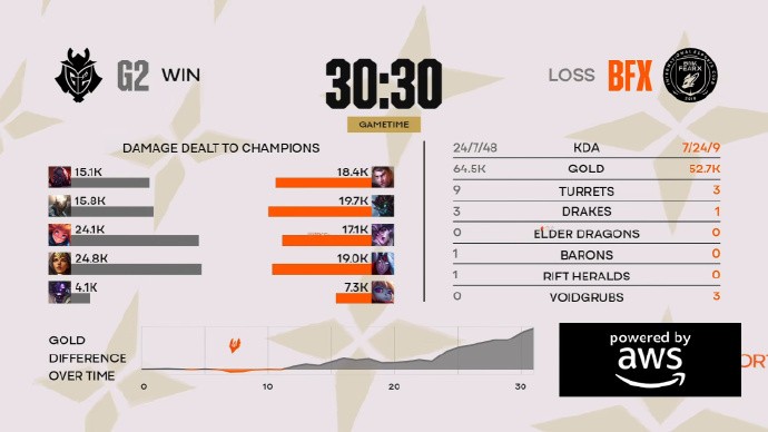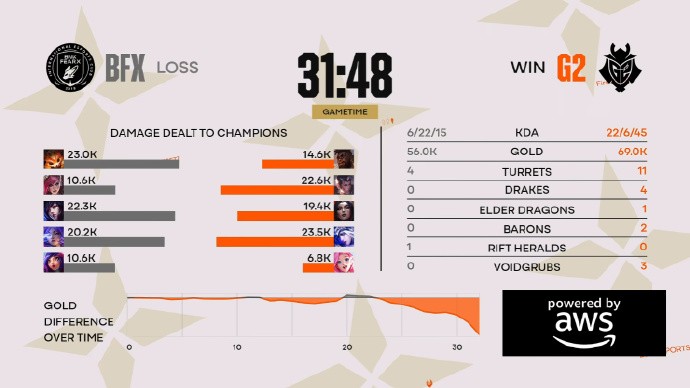 前期赵信抓下击杀妮蔻拿下一血,并控下了更多的小龙,21分钟团战Hans Sama火力全开,G2打出2换4,随后控下水龙魂,BFX无力抵抗,G2在31分钟推上高地后一波结束比赛!