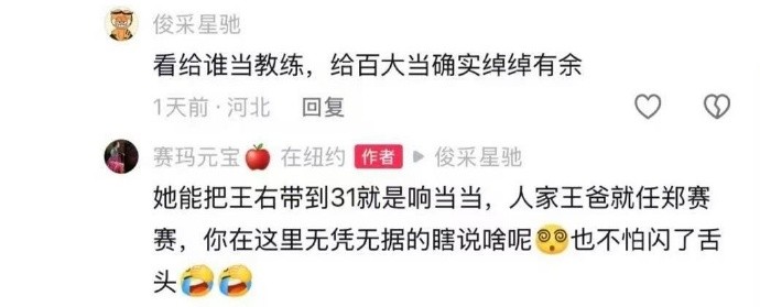 懂球帝首页>动态> 郑赛赛妈妈:教练换成赛赛,王欣瑜变成一姐了