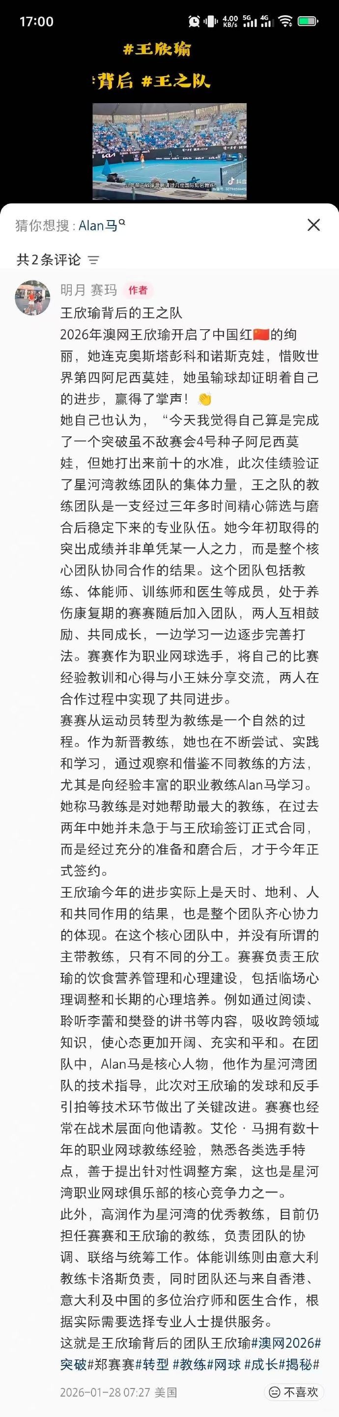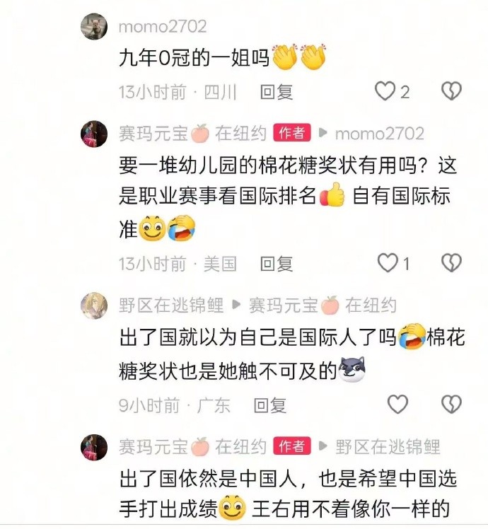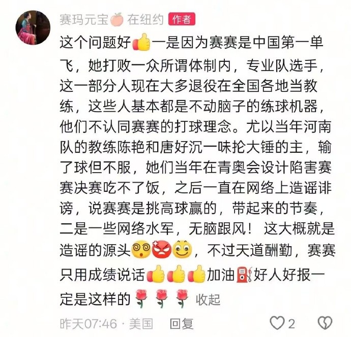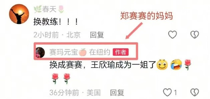 北京时间3月21日,郑赛赛母亲(网名“明月赛玛”或“赛玛元宝在纽约”)在社媒回复网友说道:“教练换成赛赛,王欣瑜变成一姐了”引发关注。据悉,郑赛赛母亲曾是西安交大任职教师,还是当时的报刊专栏作家和主持人。