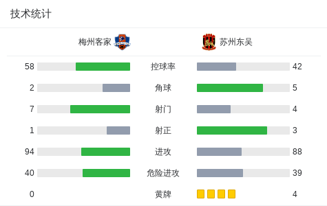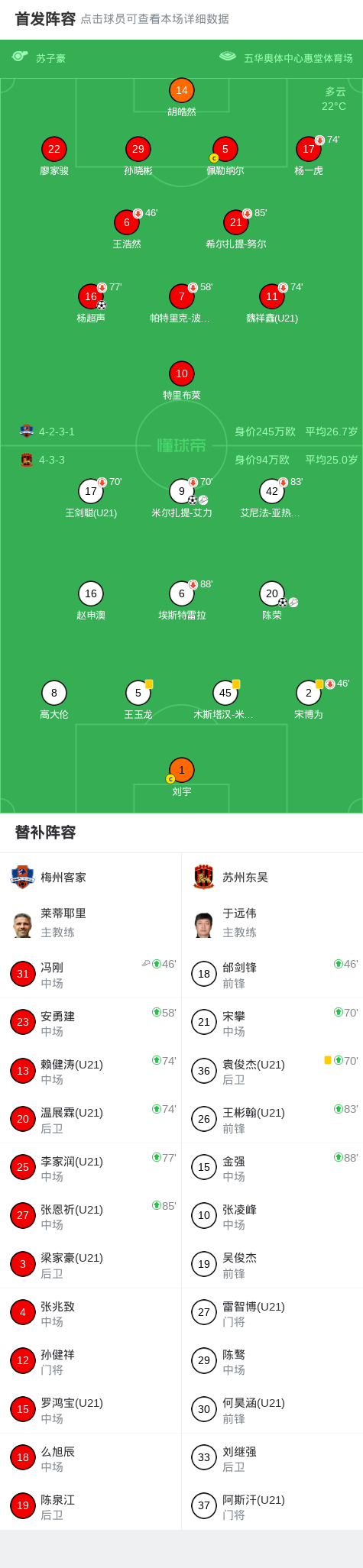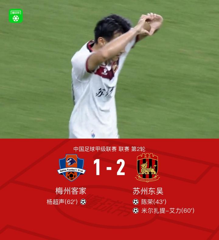北京时间3月21日中国足球甲级联赛 联赛 第2轮,梅州客家主场对阵苏州东吴。梅州客家杨超声破门。苏州东吴陈荣破门,米尔扎提-艾力破门。最终比分梅州客家 1-2 苏州东吴。