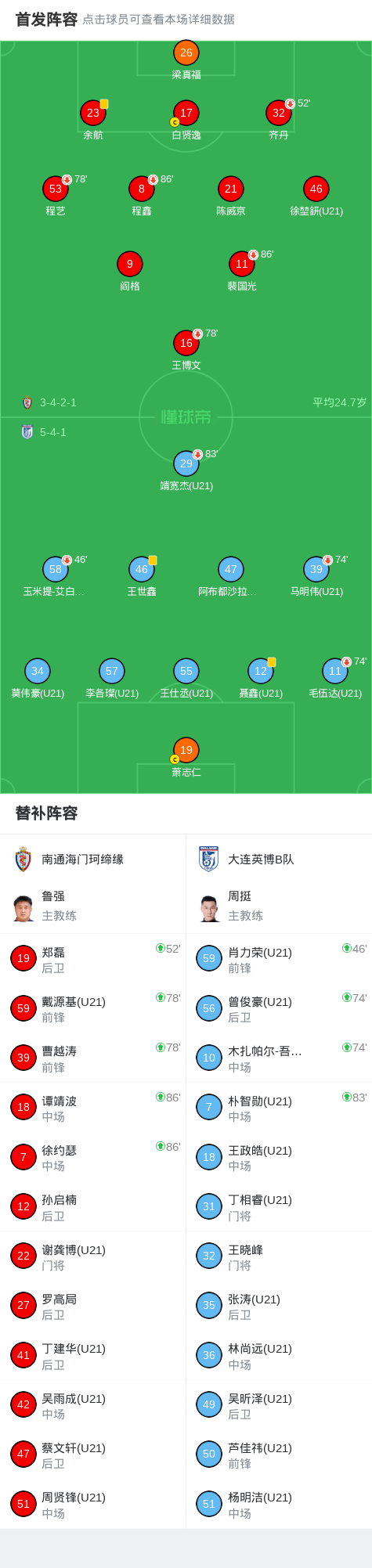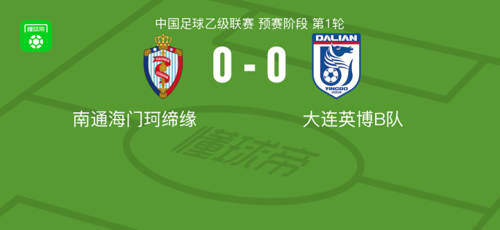 北京时间3月21日中国足球乙级联赛 预赛阶段 第1轮,南通海门珂缔缘主场对阵大连英博B队。最终比分海门珂缔缘 0-0 大连英博B队。