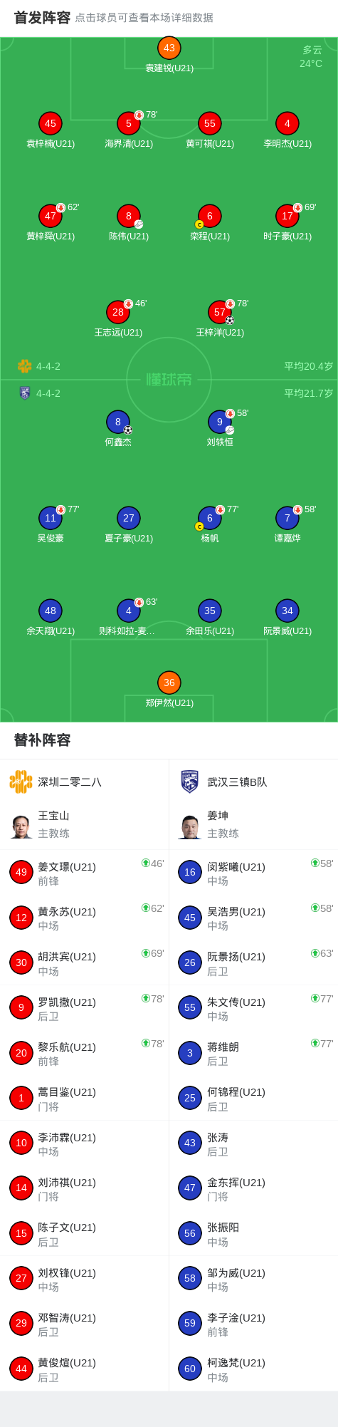 懂球帝首页>动态> 深圳二零二八1-1武汉三镇B队,何鑫杰破门,王梓洋扳平